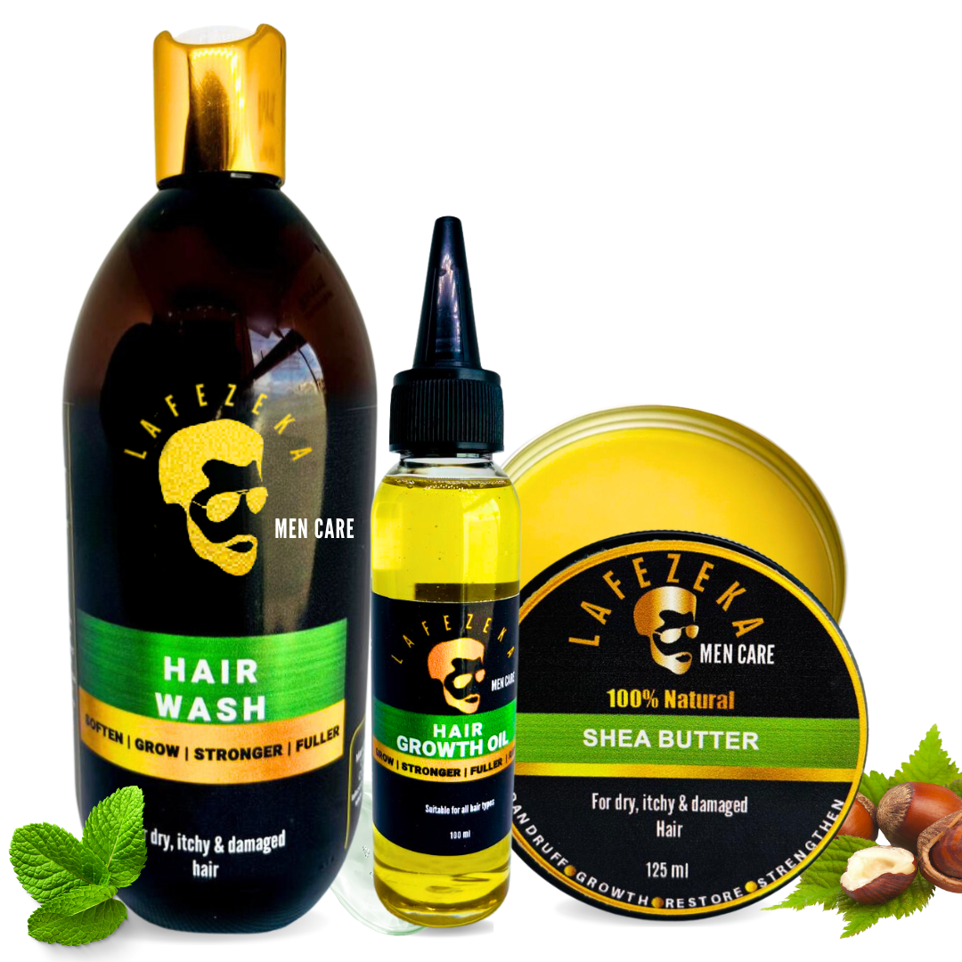 Lafezeka Men's Hair Care Collection – a comprehensive solution for the modern man's grooming needs. Elevate your hair care routine with our trio of essentials: Shea Butter, Shampoo, and Hair Growth Oil.